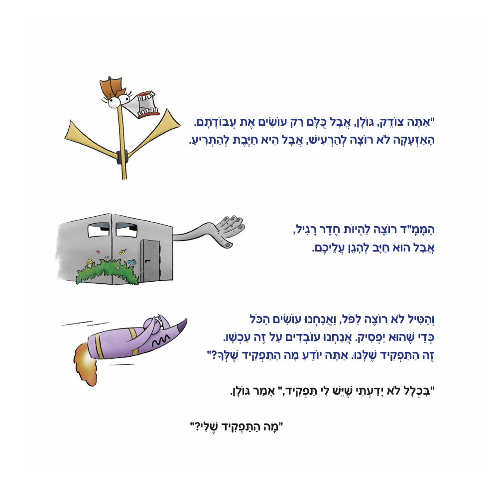 במילים אחרות, הספר מספק תשובות לשאלות כמו "למה יש אזעקה חזקה?" או "למה אנחנו צריכים ממ"ד?" המותאמות לילדים ולעולמם העדין.